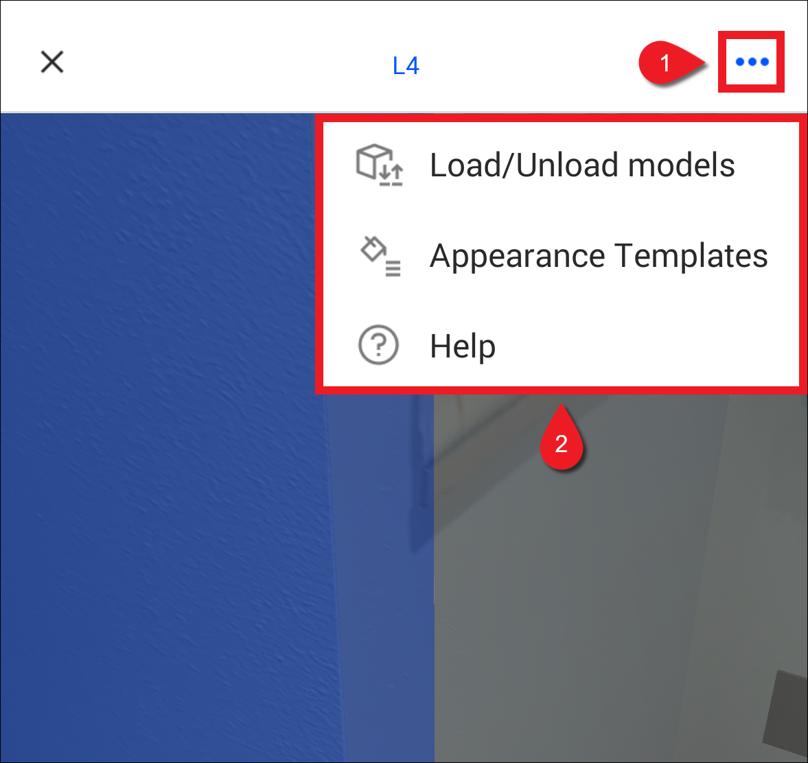 Sie können Modelle laden/entladen und Darstellungsvorlagen anwenden, indem Sie das Menü Aktionen öffnen und auf Modelle laden/entladen oder Darstellungsvorlagen tippen. Die Hilfeseite ist ebenfalls verfügbar und bietet eine kurze Beschreibung der AR-Tools und -Funktionen.