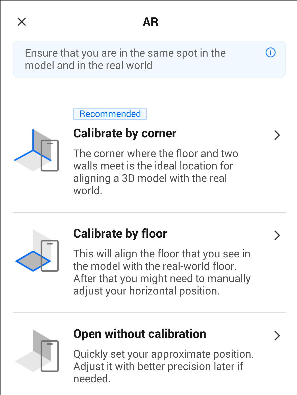 Wenn Sie den Raum wechseln oder feststellen, dass das Modell von Ihrer realen Position abgedriftet ist, können Sie das AR-Modell für eine bessere Genauigkeit neu kalibrieren. Tippen Sie im AR-Modus auf Kalibrieren , um den Kalibrierungsbildschirm zu öffnen, und wählen Sie dann einen Kalibrierungstyp.