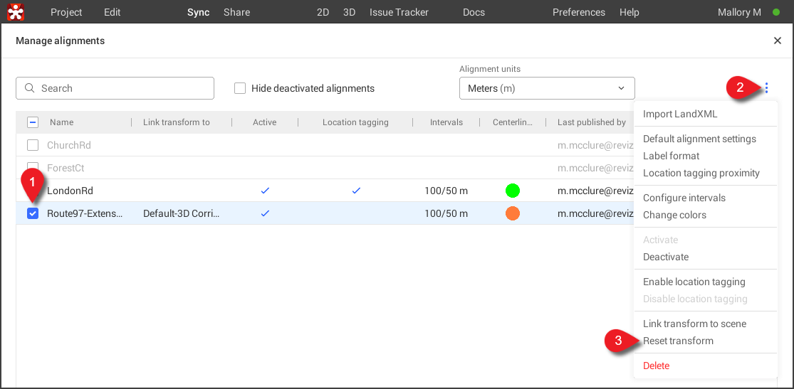 Die Lineare Navigation ist ein leistungsstarkes Tool für lineare Infrastrukturprojekte und ermöglicht es Ihnen, Achslinien (oder Mittellinien) und Abschnitte (auch als Stationen oder Stationierung bekannt) in Revizto-Projekten zu untersuchen und zu verwalten. Achslinien können einem Projekt direkt aus unterstützten Autorentools (z. B. Bentley OpenRoads, OpenRail oder Civil 3D) hinzugefügt werden oder durch manuelles Importieren von LandXML-Dateien.