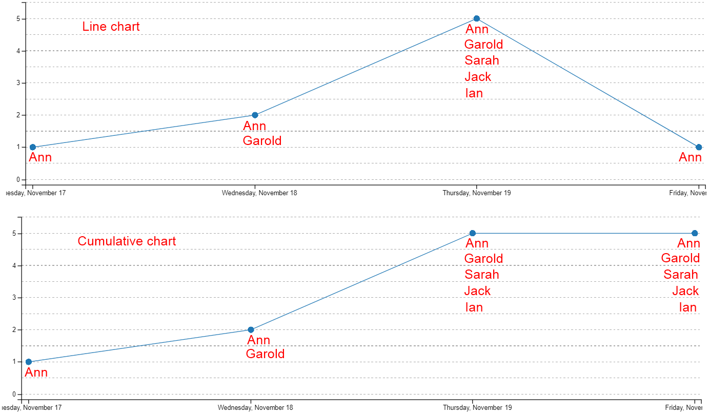 Das Liniendiagramm zeigt, dass am vierten Tag nur Ann gearbeitet hat. Das kumulierte Liniendiagramm zeigt, dass bis zum vierten Tag fünf Personen am Projekt gearbeitet haben.