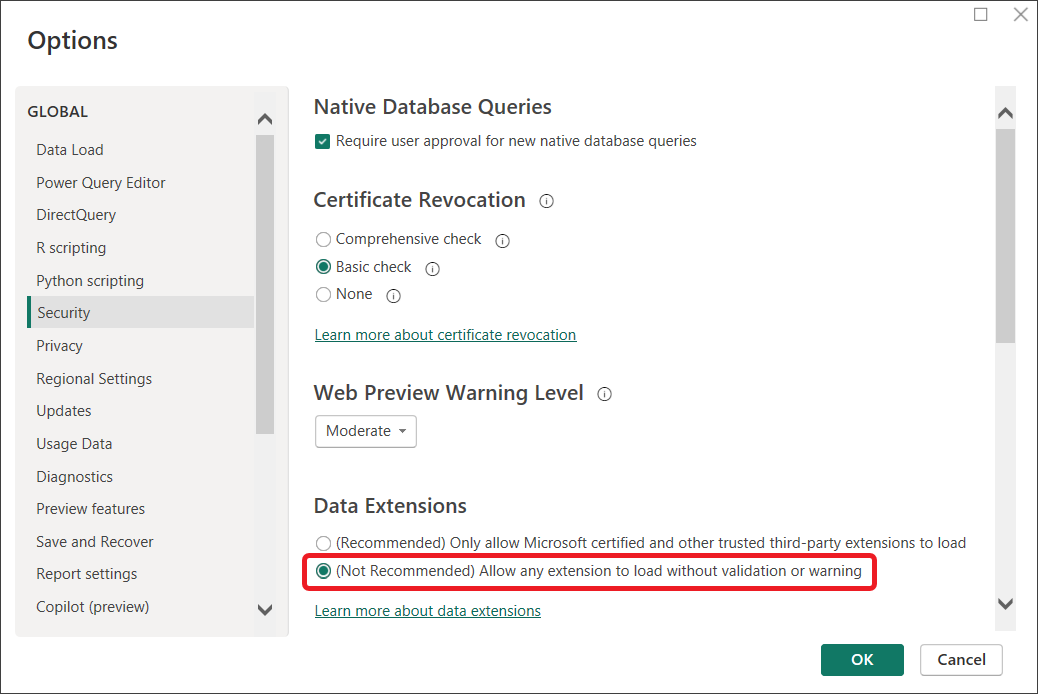 Wählen Sie im Abschnitt Datenerweiterungen die Option (Nicht empfohlen) Alle Erweiterungen ohne Überprüfung oder Warnung laden. Dadurch können Sie einen externen Connector laden.