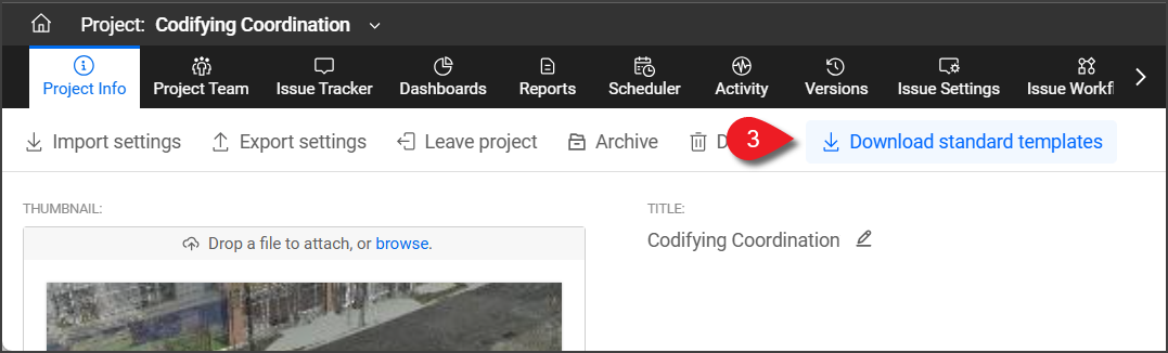 Für das Herunterladen der Revizto-Standardvorlagen spielt es keine Rolle, welches Projekt Sie öffnen. Sie können später jedes Ihrer Projekte mit dem Dashboard verknüpfen.