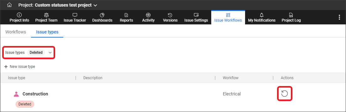 You can view deleted issue types in the Issue types tab by filtering by "Deleted" in the upper-left corner. Deleted issue types can be restored by clicking Restore in the Actions column next to the issue type. Restored issue types will be automatically reassigned to the workflow they were assigned to before being deleted.