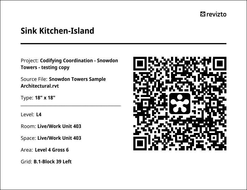 Revizto generates QR codes in two formats, A4 and sticker format. The fields shown on each are listed below: