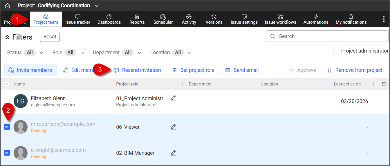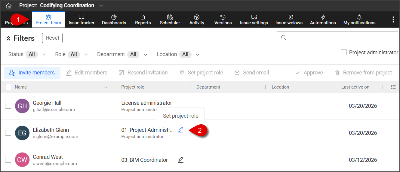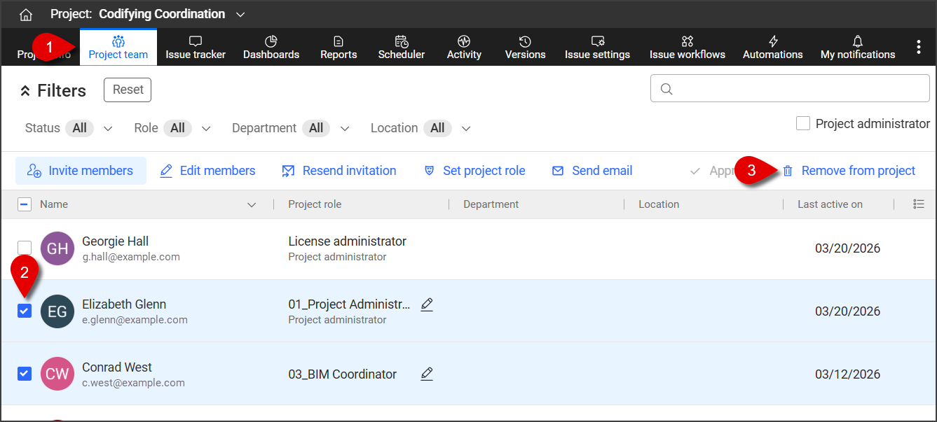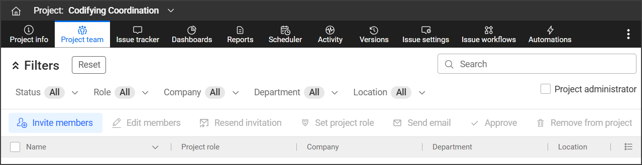 You can filter the list of project members by status, role, company, department, and location. Selecting the Project administrators checkbox will show only Project administrators for the project, along with any filters you've applied.