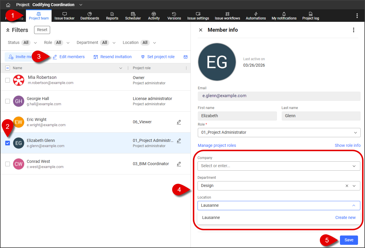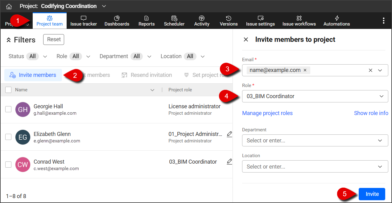 - If you invite a user who is already a project member, their profile details (such as their role, company, department, or location) will be updated.