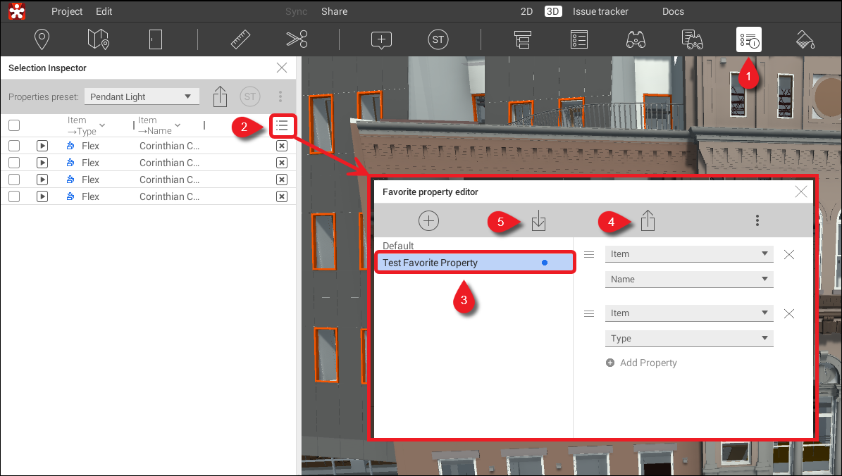 Las propiedades favoritas se pueden compartir, importar y exportar a través del panel Inspector de selección dentro del entorno 3D de Revizto.