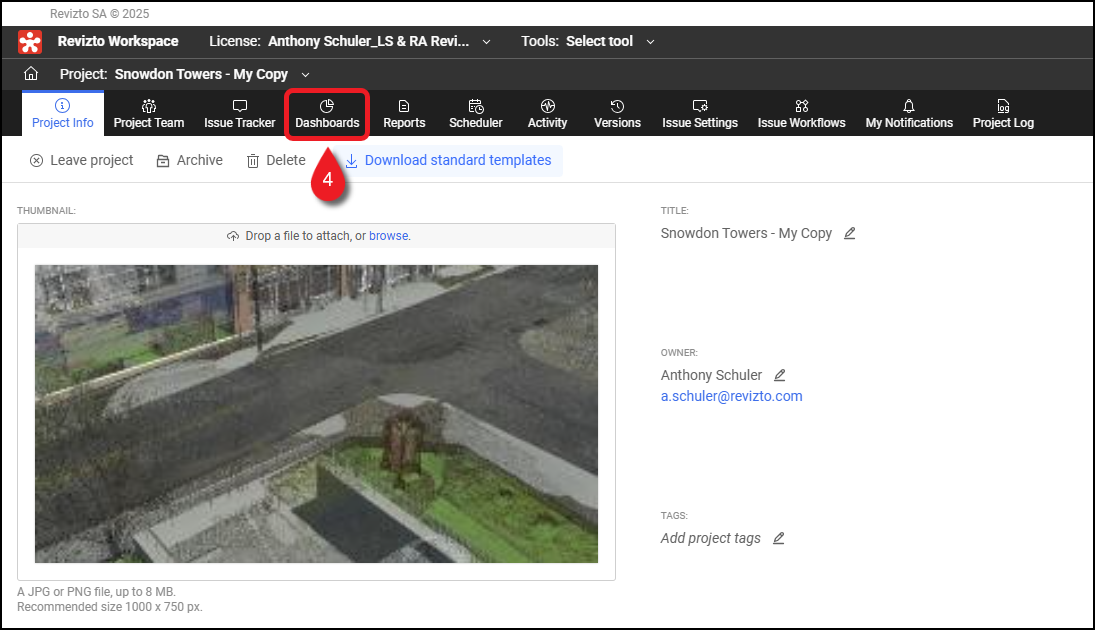 Puede acceder a los tableros desde la pestaña Tableros en Revizto Workspace.