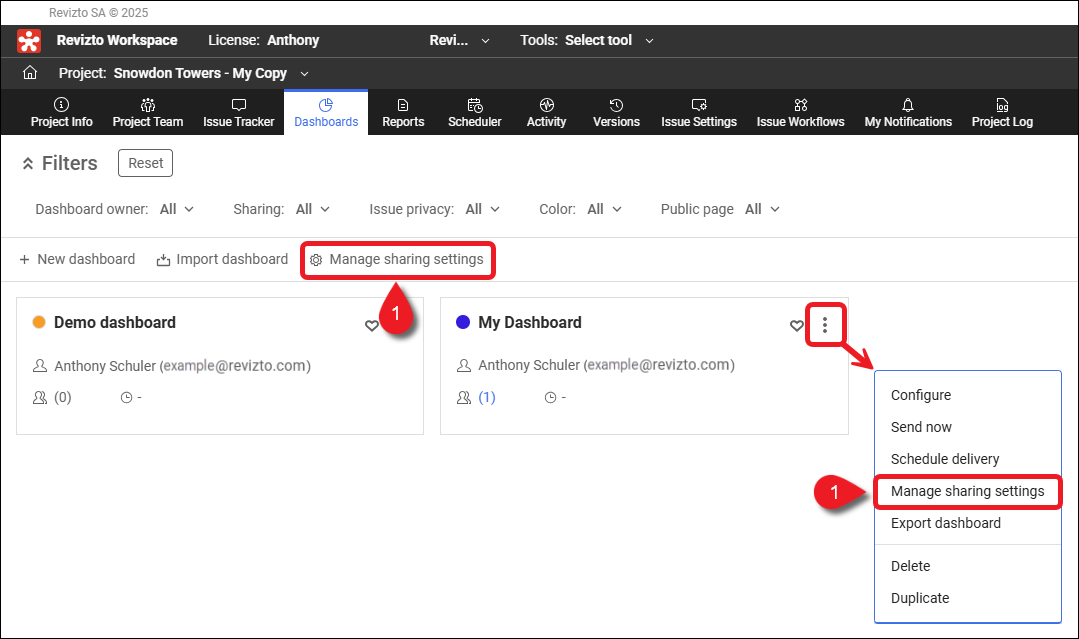 Los tableros contienen gráficos con datos de incidencias del proyecto. Puede crear y compartir vínculos públicos de tableros mediante Administrar configuración de uso compartido o desde las páginas de los tableros individuales en Revizto Workspace.