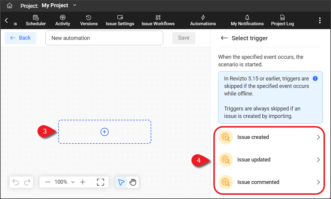 Es posible que las automatizaciones no funcionen correctamente en incidencias que se importaron o se editaron fuera de línea en Revizto versión 5.15 o versiones anteriores. Además, los eventos desencadenantes de la automatización no se ejecutarán si las incidencias se importan desde cualquier versión de Revizto.