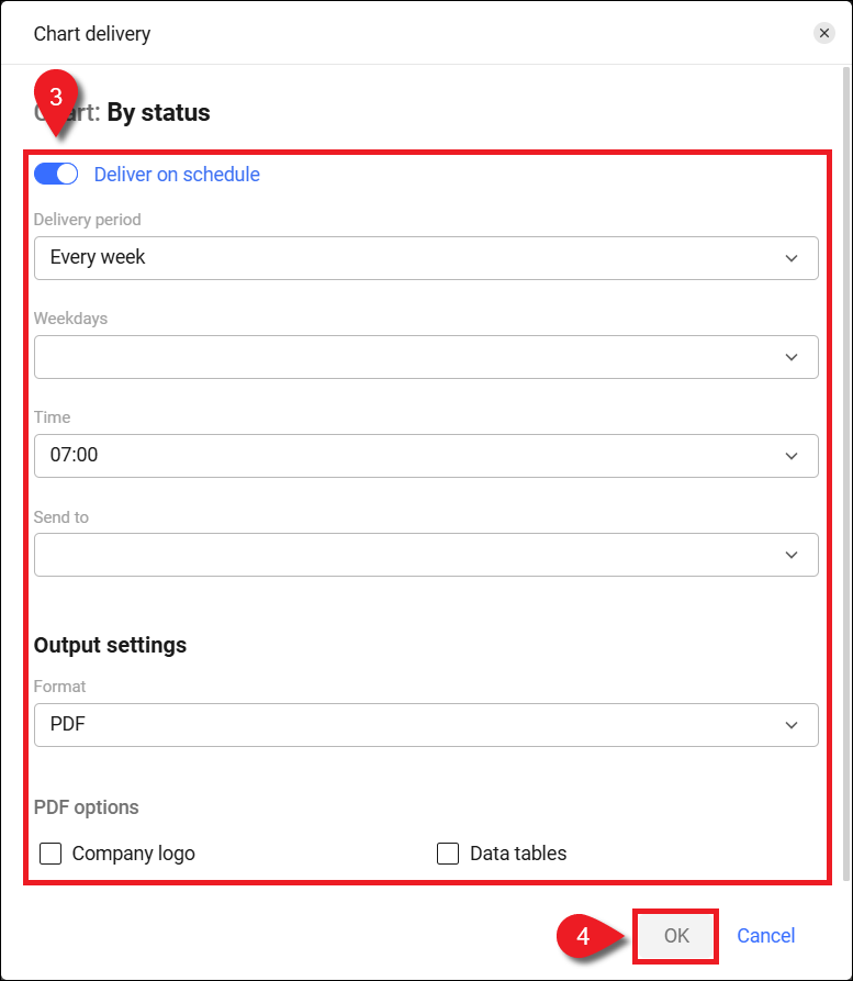 - Active Entregar en el plazo planificado y luego ingrese la configuración de la entrega. Puede elegir miembros del proyecto en el cuadro de selección Enviar a o ingresar las direcciones de correo electrónico para los destinatarios externos.