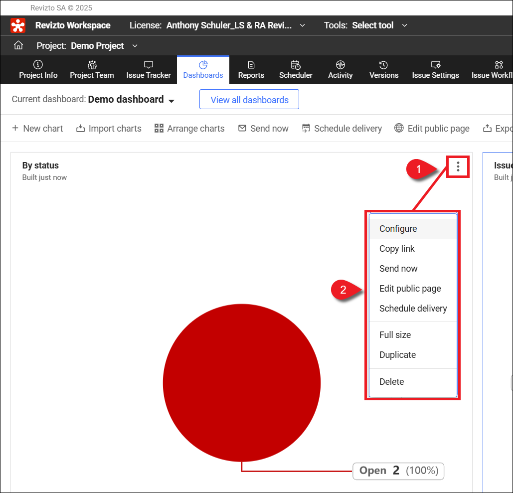 Los gráficos son componentes de los tableros y son una forma sencilla de analizar los datos de su proyecto de Revizto. Mediante la configuración del gráfico, puede especificar cómo y qué datos se muestran.