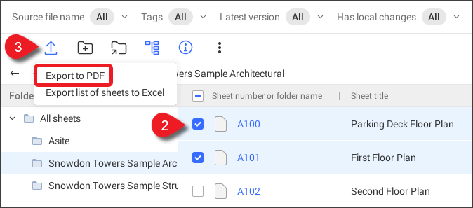 Los planos de la galería 2D de Revizto pueden exportarse a PDF por usuarios que tengan el derecho de acceso “Exportar planos a PDF”. Todos los usuarios de un proyecto también pueden exportar listas de planos especificados a Excel para resumir información clave sobre esos planos. Los planos se exportan desde la galería de planos del entorno 2D de Revizto.
