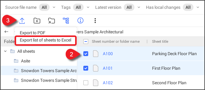Puede exportar una lista de planos a una hoja de cálculo de Excel que resuma información clave sobre los planos, como el número de plano, el nombre, la fecha de última sincronización, el total de incidencias y las etiquetas.