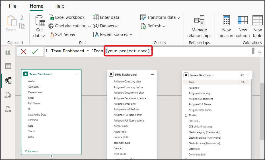 Asigne cada tabla de la plantilla (Team Dashboard, Diffs Dashboard, Issues Dashboard) a su proyecto.