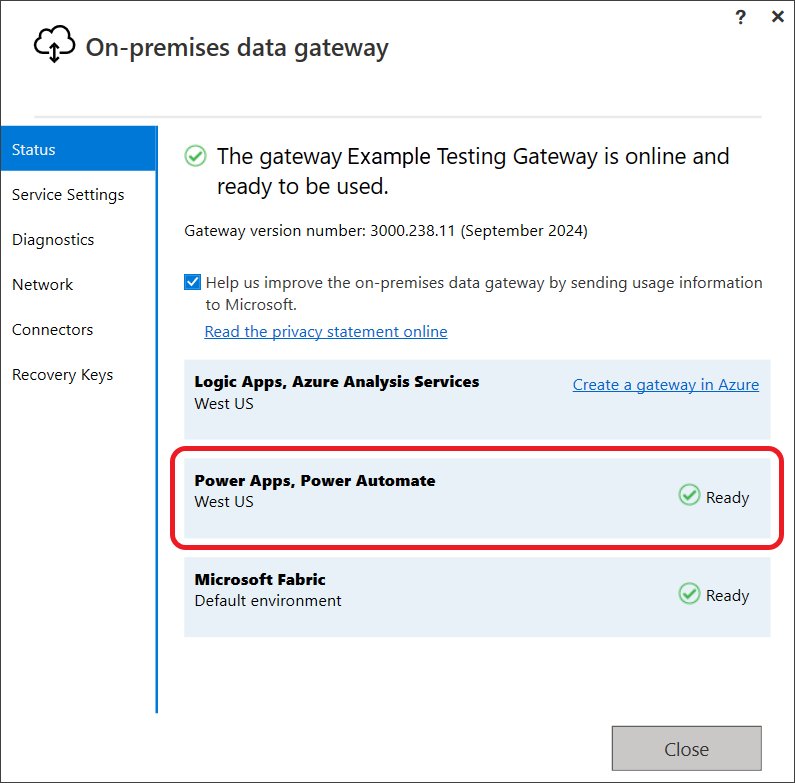 En la pestaña de estado de On-premises data gateway, confirme que Power Apps, Power Automate esté en línea. Si está en línea, pondrá Listo.