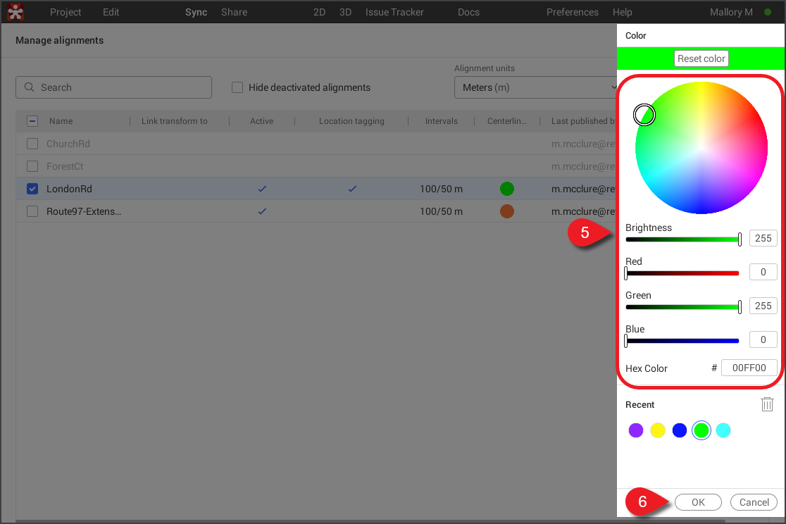 Sélectionnez la couleur à l’aide de la roue, des curseurs, d’un code de couleur HEX ou de la section des couleurs récentes.
