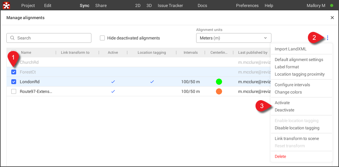 Gérer les tracés peut être ouvert depuis le volet de navigation linéaire dans l’environnement 3D de Revizto ou depuis le menu Modifier.