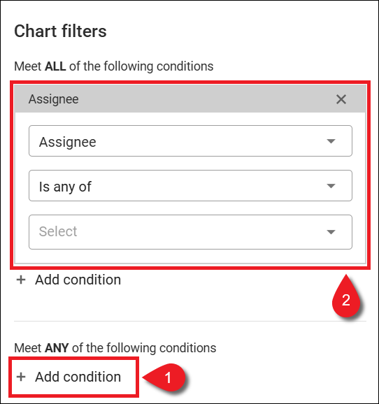 Vous pouvez ajouter plusieurs conditions pour créer votre filtre de graphique en cliquant sur + Ajouter une condition. Les conditions de filtres sont divisées entre « Remplir TOUTES les conditions suivantes » et « Remplir l’UNE des conditions suivantes », mais les deux catégories possèdent les mêmes options. Les conditions de filtres du graphique sont immédiatement affichées sur le graphique en cours lorsqu’elles sont ajoutées.