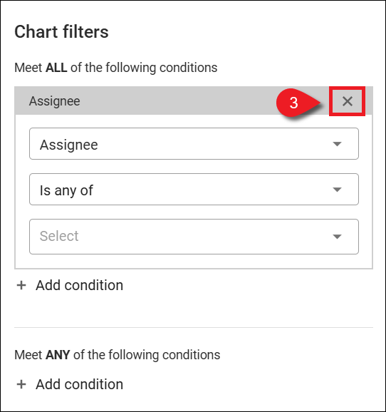 Les filtres du graphique se créent en cliquant sur + Ajouter une condition et en sélectionnant vos options de conditions. Vous pouvez supprimer une condition en cliquant sur le X de cette condition.