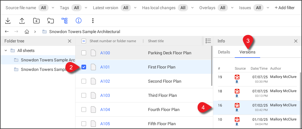 Les utilisateurs disposant du droit d’accès « Exporter les feuilles au format PDF » peuvent exporter des versions précédentes d’une feuille au format PDF depuis l’historique des modifications de la feuille dans la galerie 2D. Comme l’historique des modifications ne peut être consulté qu’une feuille à la fois, les versions précédentes de feuilles ne peuvent pas être exportées en PDF par lot.