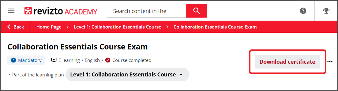 - 認定コースの試験ページの上部にある[証明書のダウンロード]をクリックします。