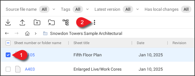 2D環境では、適切な権限を持つユーザーは、シートの名前の変更と削除、シートのタグの管理ができます。 シートおよびそのタグを管理すると、シート情報を最新かつ整理された状態に保てます。 シートは、Reviztoの2D環境にあるシートギャラリーから管理します。
