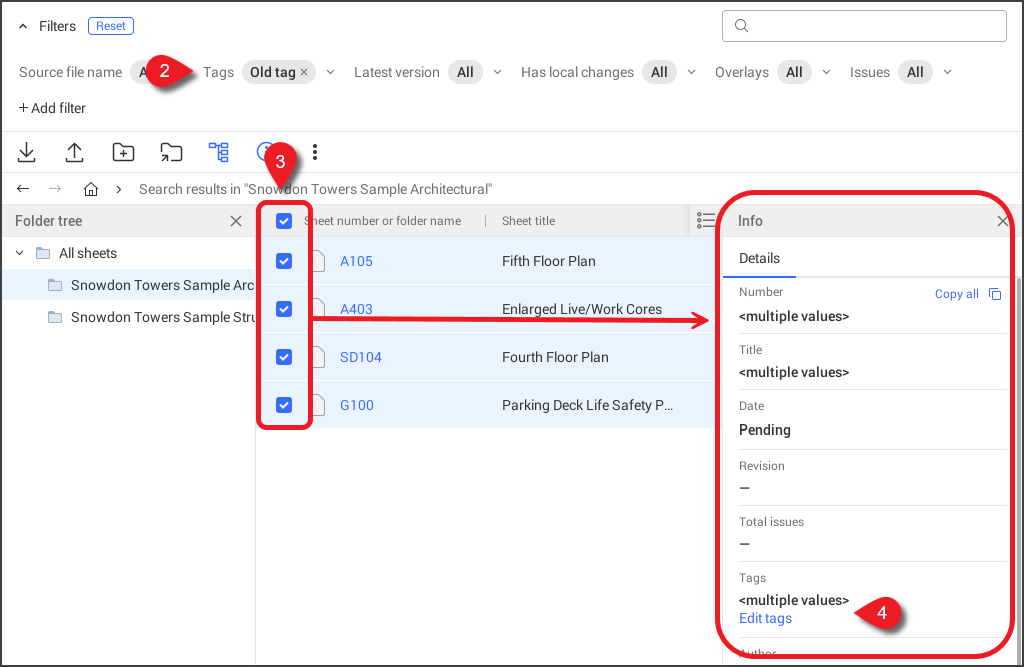 Reviztoの「新しいシートの追加」権限を持つユーザーは、自分がReviztoに公開したシートのタグを追加および削除できます。一方、Reviztoの「すべてのシートの管理」権限を持つユーザーは、任意のシートのタグを追加および削除できます。 タグの追加または削除は、単一のシートや複数のシートで、あるいはフォルダー内のすべてのシートに一括で実行できます。