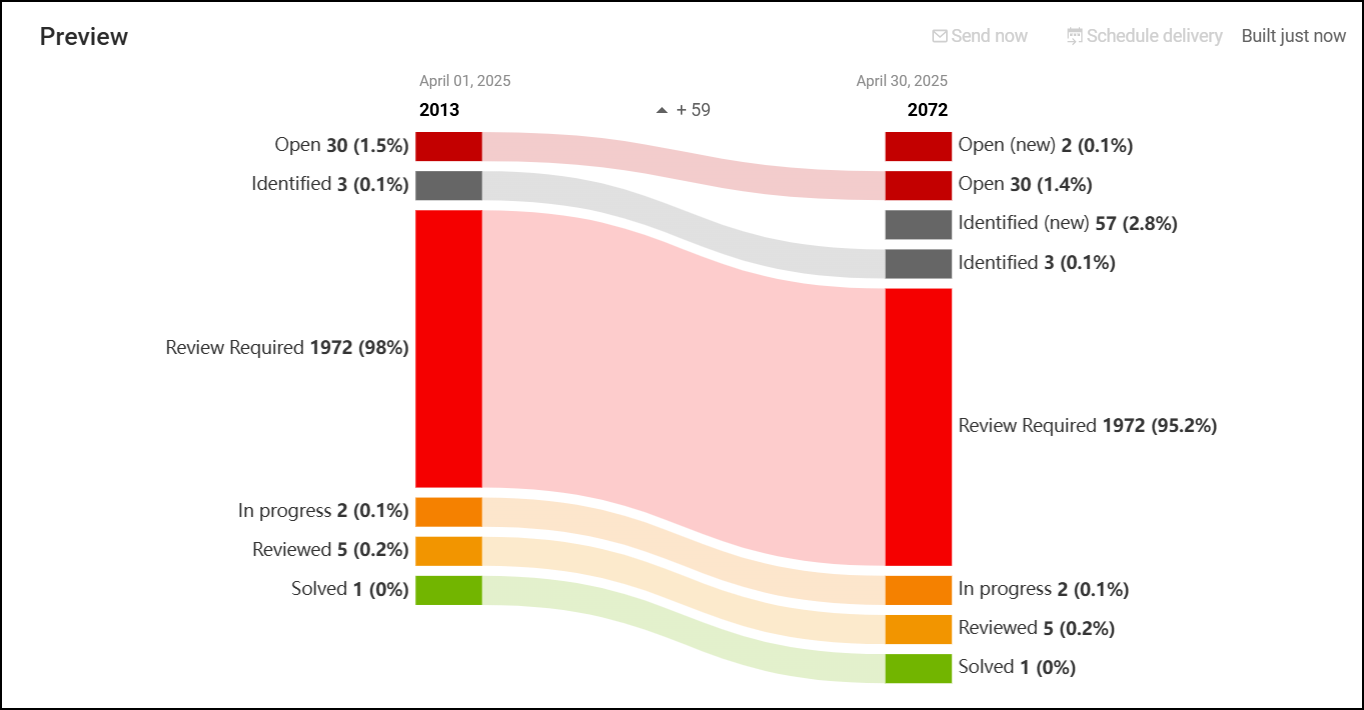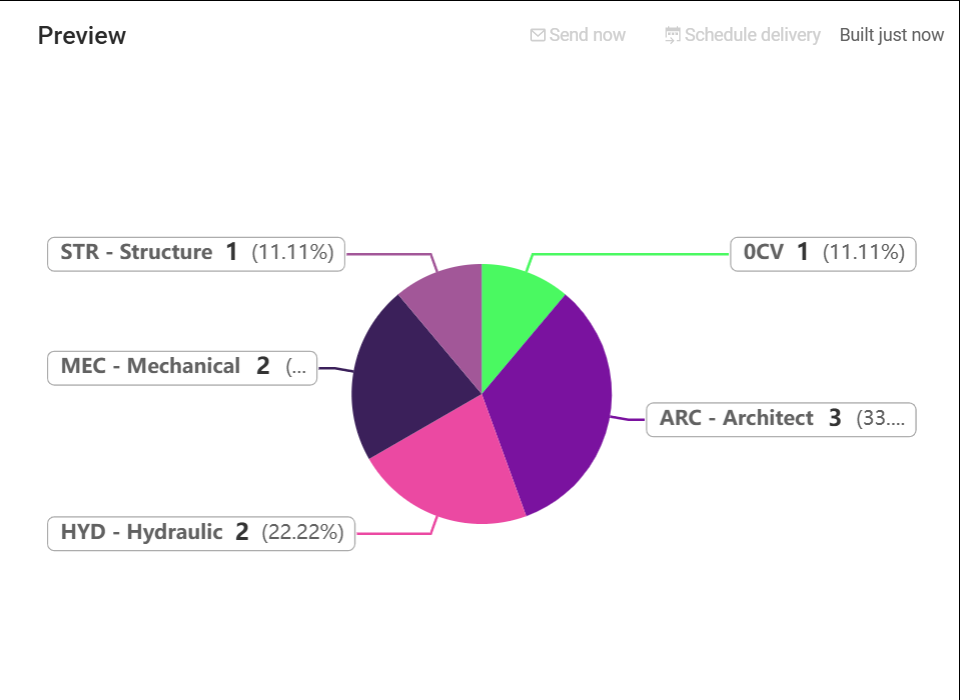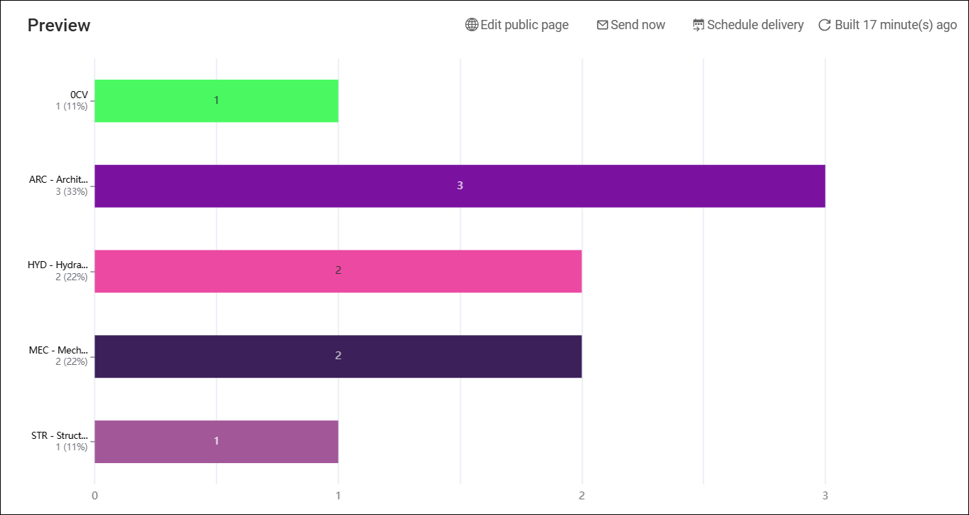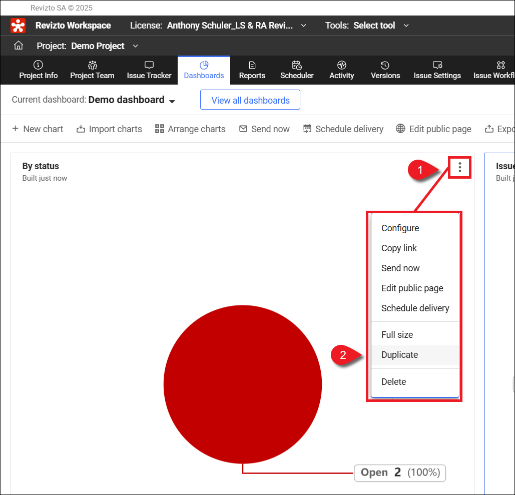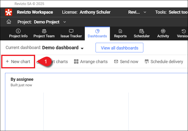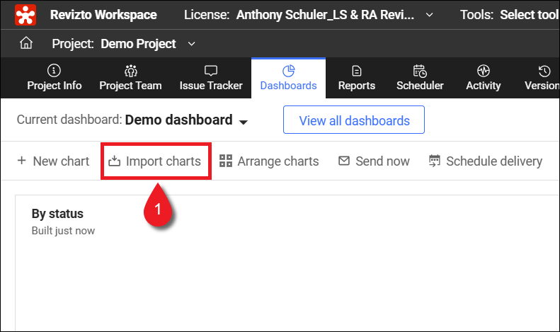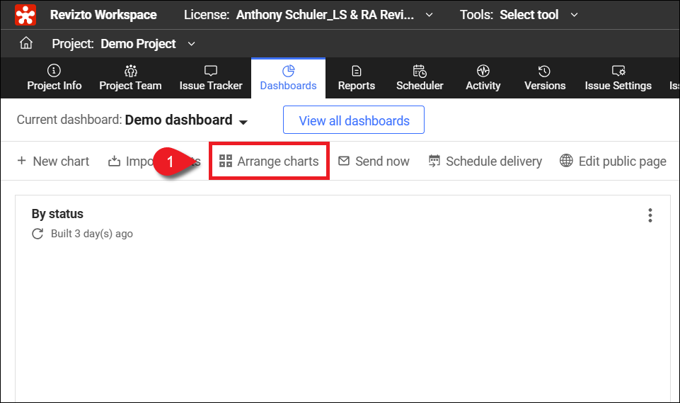 ダッシュボードの構成要素であるグラフを使うと、Reviztoプロジェクトのデータを簡単に分析できます。 データの表示方法と表示するデータは、グラフ設定で指定できます。