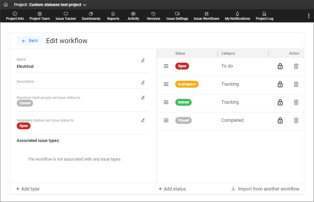 在 Revizto Workspace 中为项目设置自定义状态后,它们将可在问题追踪器环境中使用。