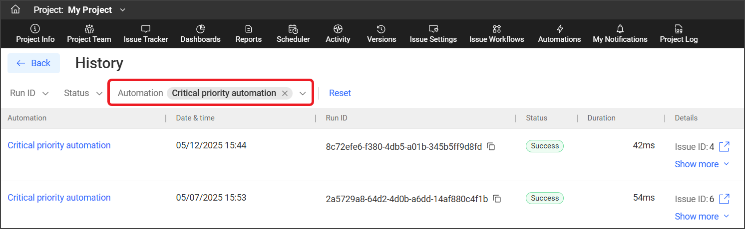 自动化历史记录中的每一行都代表项目中某个自动化的一次独立运行。 您可以单击某次运行的“详细信息”列中的“显示更多”,以查看该次运行的具体信息,包括被处理问题的问题 ID,以及问题字段是否被成功更新。 您可以单击“在问题追踪器中查看” 或“在自动化中查看”