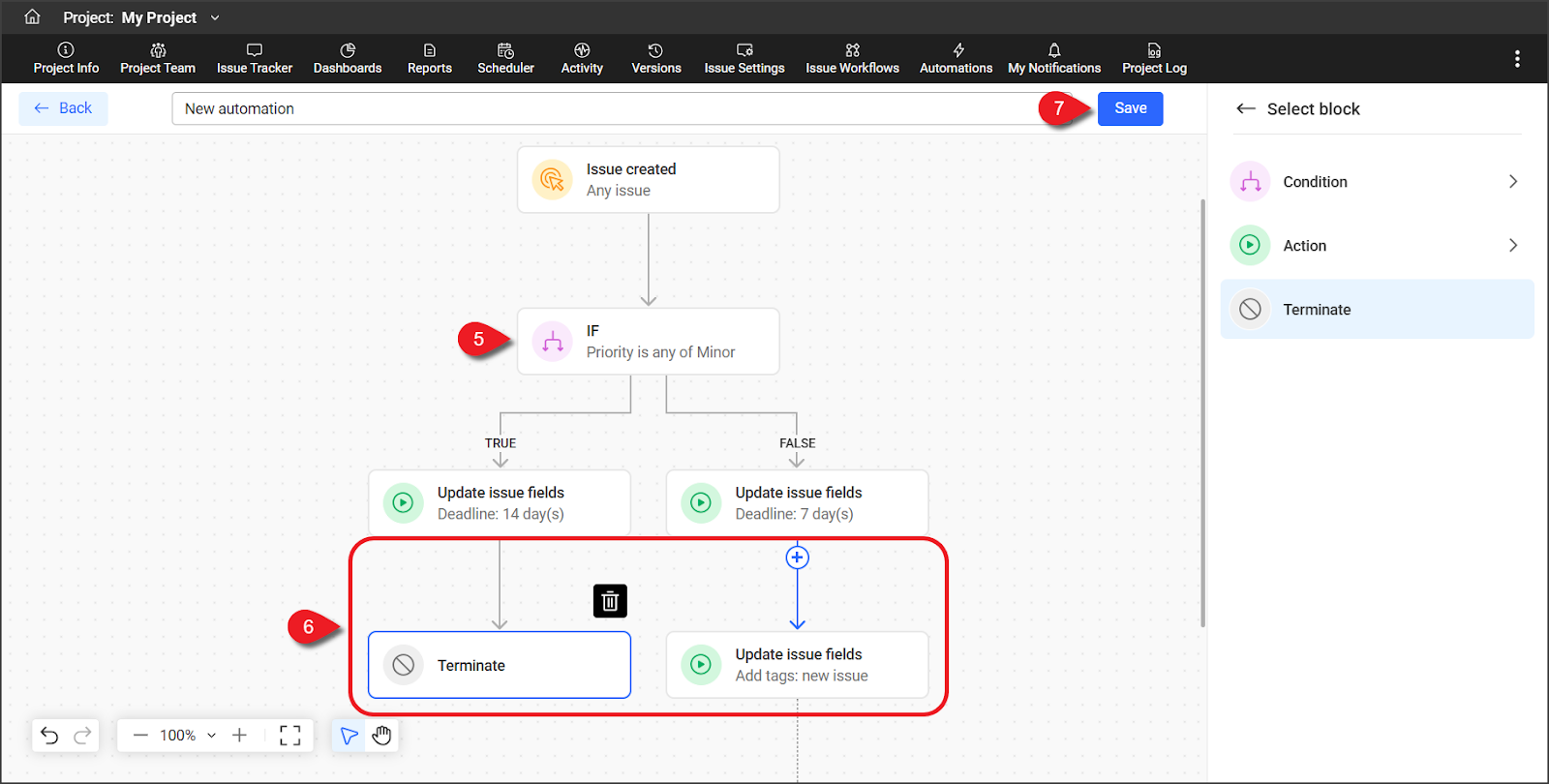 删除触发器、操作或终止区块只会移除该特定区块。 删除条件将移除该条件区块及其附加区块。