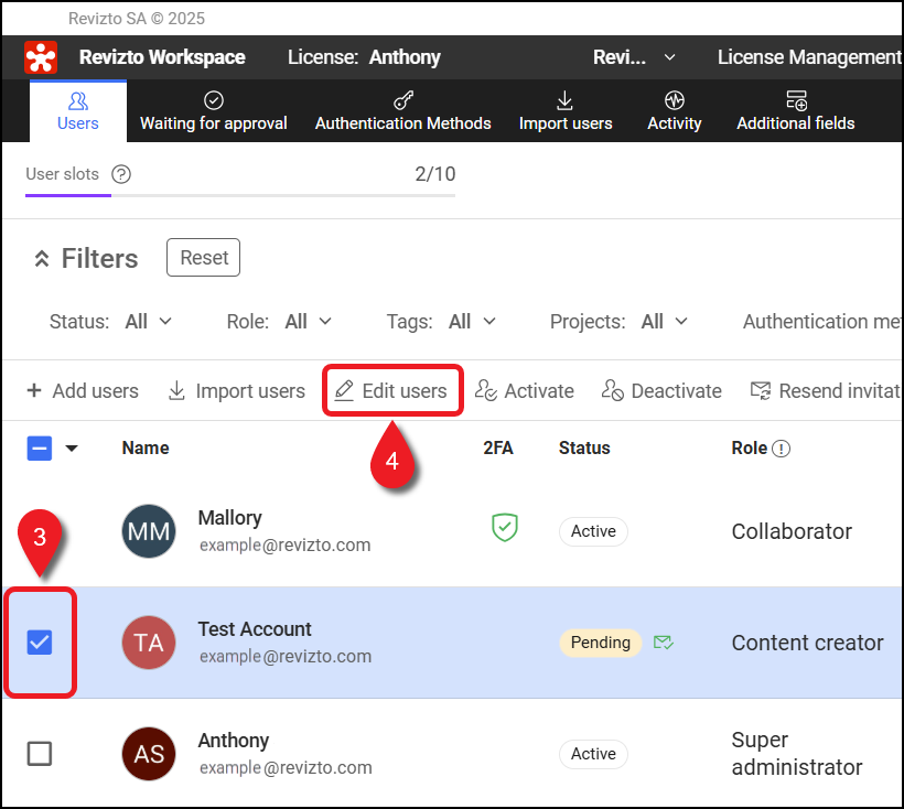 许可证管理员可以在 Revizto Workspace 的“用户管理”页面编辑并更新用户详细信息。