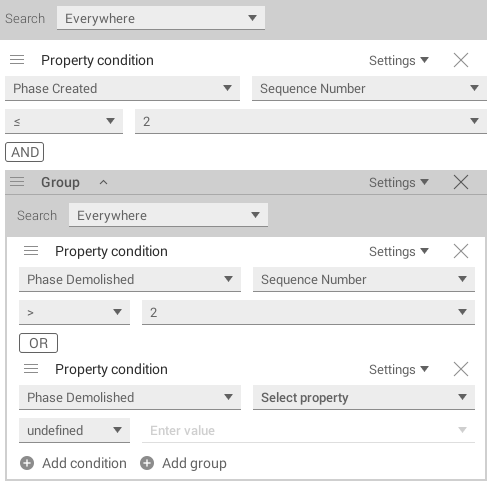 在 Revizto 应用程序中,使用基于阶段相关属性的条件创建搜索。